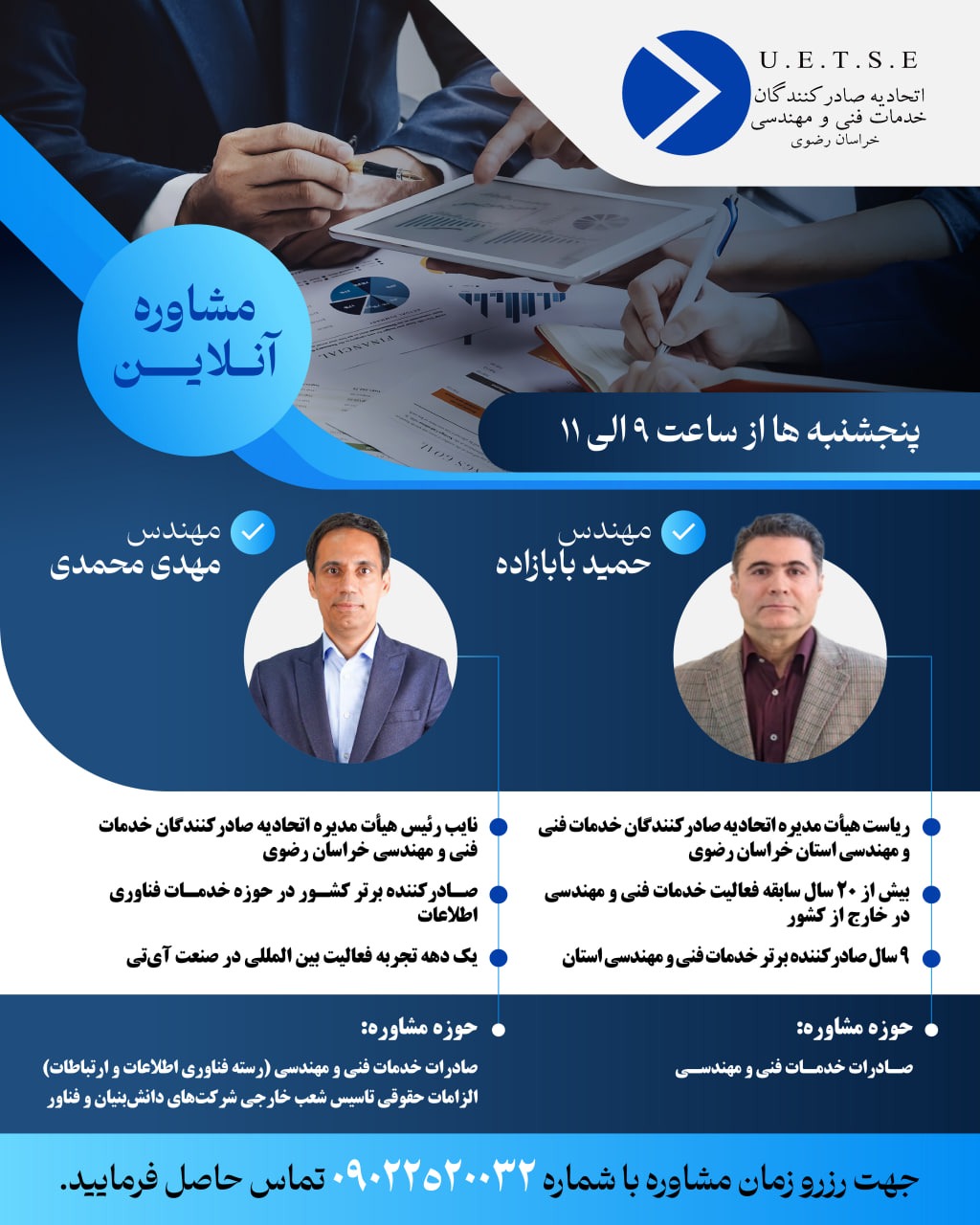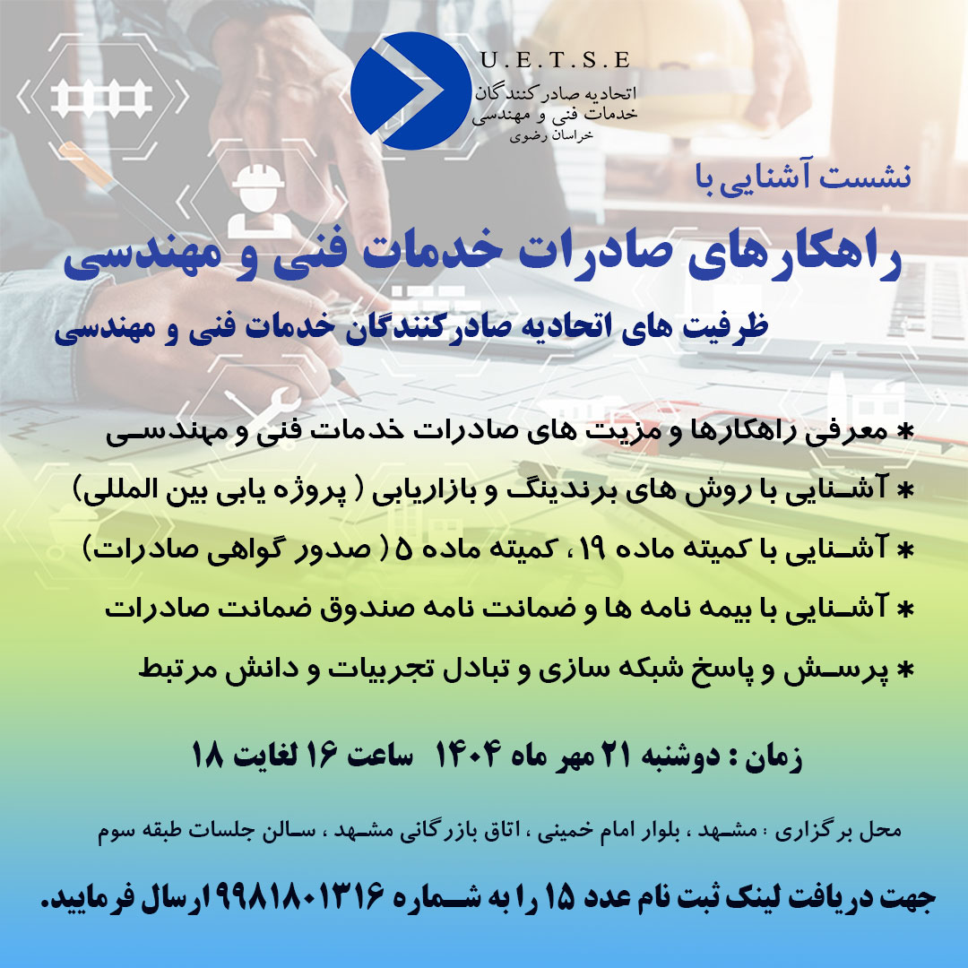 اتحادیه صادرکنندگان خدمات فنی و مهندسی استان خراسان رضوی با همکاری شرکت سبک برتر اقدام به اعزام هیات تجاری و تخصصی ساختمان و عمران به کشور عراق نموده است ، این رویداد همزمان با نمایشگاه تخصصی صنعت ساختمان و سرمایه گذاری بغداد برگزار می گردد . هیات اعزامی از شهرهای بغداد ، نجف ، کربلا ، دیوانیه بازدید خواهند نمود و ضمن بازدید تخصصی از نمایشگاه و برگزاری جلسات B2B با شرکت کنندگان و متخصصین این حوزه ارتباط برقرار می نمایند .